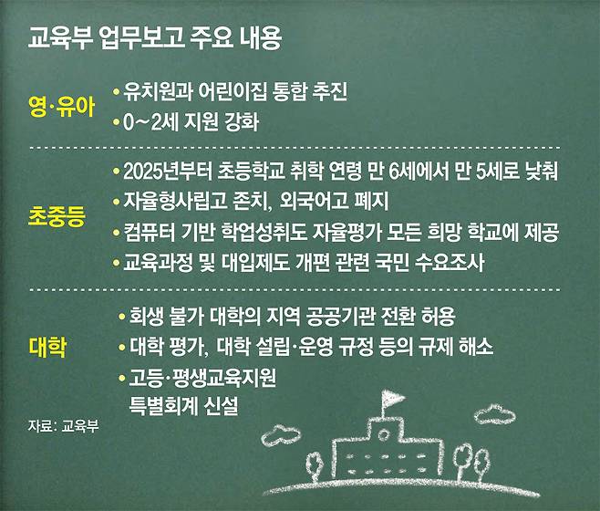 2025년부터 초등학교 취학 연령이 현재 만 6세에서 만 5세로 1년 빨라진다. 2025학년도부터 폐지될 예정이던 자율형사립고(자사고)는 유지되고 외국어고만 폐지될 것으로 전망된다. 교육부는 29일 업무보고를 통해 이 같은 내용을 윤석열 대통령에게 보고했다.