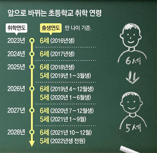 교육부는 이날 6세부터 시작하는 ‘초등학교 6년, 중학교 3년, 고등학교 3년’의 의무교육 12년 과정을 5세에 시작하는 학제 개편을 추진하겠다고 밝혔다. 박순애 사회부총리 겸 교육부 장관은 “2025년부터 단계적으로 초등 취학 연령을 앞당길 것”이라고 말했다. 정부 계획에 따르면 2025년에는 6세인 2018년생과 5세인 2019년생 중 1∼3월 출생자가 함께 초등학교에 들어간다. 이후 2026년엔 5세(2020년생) 중 1∼6월, 2027년엔 5세(2021년생) 중 1∼9월 출생자가 6세와 함께 초등학생이 된다. 2028년에는 모든 5세(2022년생)가 초등학교에 진학하게 된다.