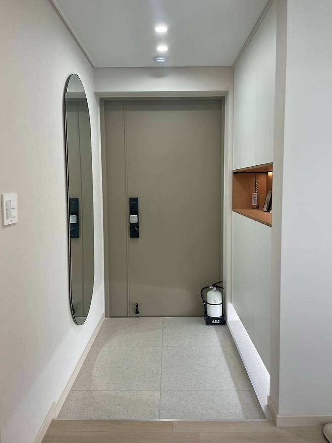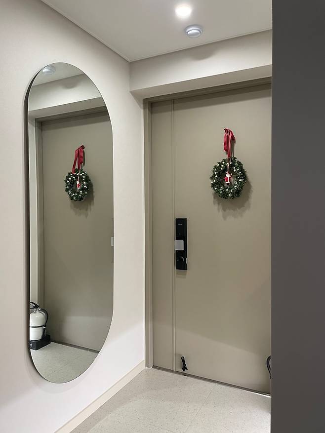 두 번째는 큰 타원형 전신거울이었어요. 한쪽 벽을 외출 전에 체크할 수 있는 큰 전신거울로 채우고 싶었어요. 사진에 보이는 귀여운 리스는 크리스마스 때 현관문에 달아 장식했었어요.