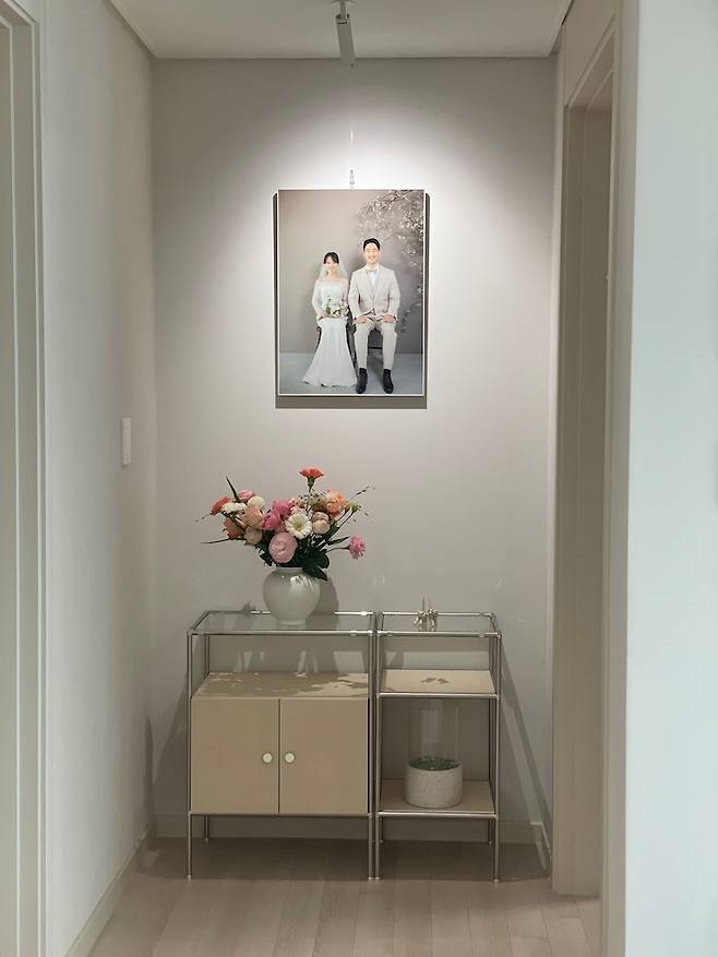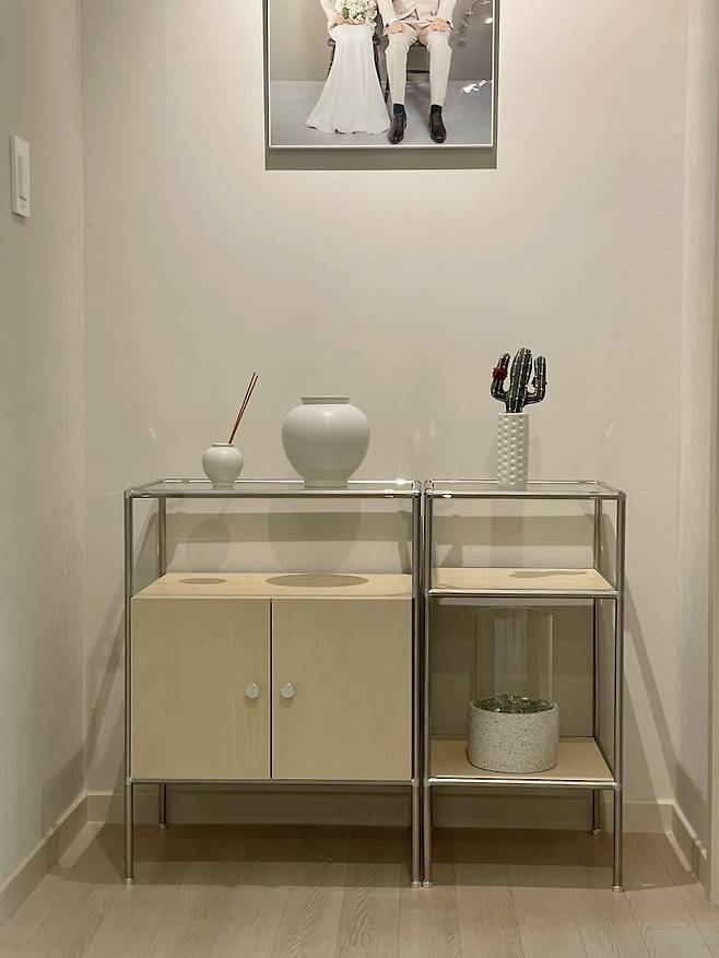 그리고 세 번째는! 오픈 선반입니다. 저희 부부는 결혼기념일마다 기념사진을 찍어보고 있어요. 현관 장식장에 웨딩사진과 기념일 사진을 두었어요. 점점 포동 해지고 있지만 행복한 우리의 모습을 보면 괜히 흐뭇하더라고요.