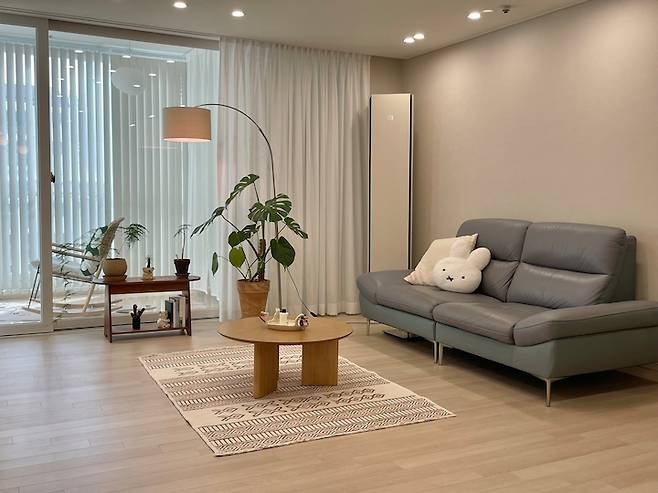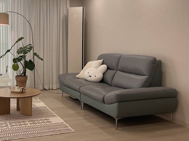 요즘 집에 소파를 안 두시는 분들도 많이 계시더라고요. 저는 집에 소파가 있는 생활이 익숙해요. 집에 와서 바로 쉬고 싶지만 씻기 전에 침대는 절대 들어가지 않기 때문에 소파가 꼭 필요했어요. 저희 집 소파는 이전 신혼집에서부터 쓰던 3인용 소파예요.