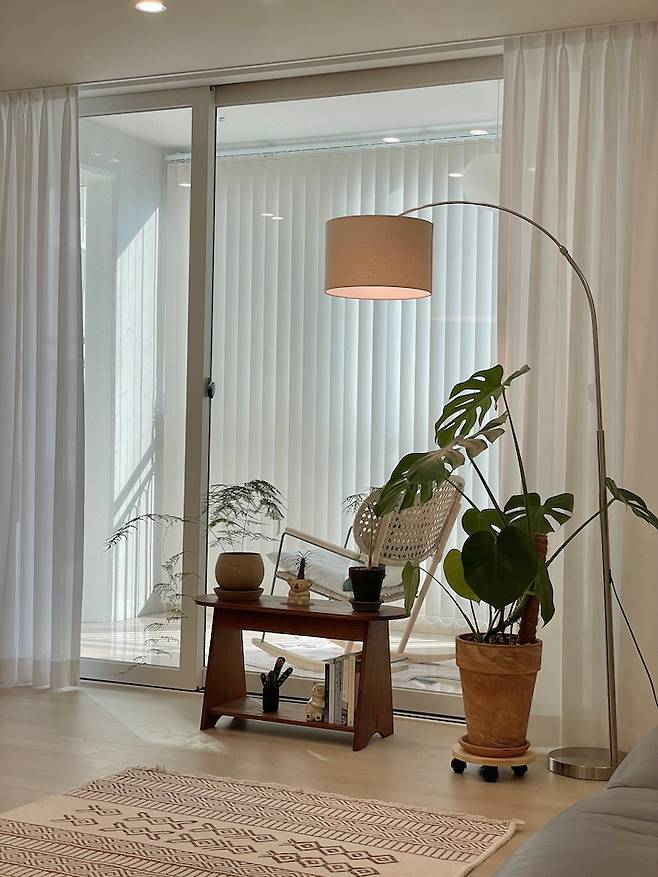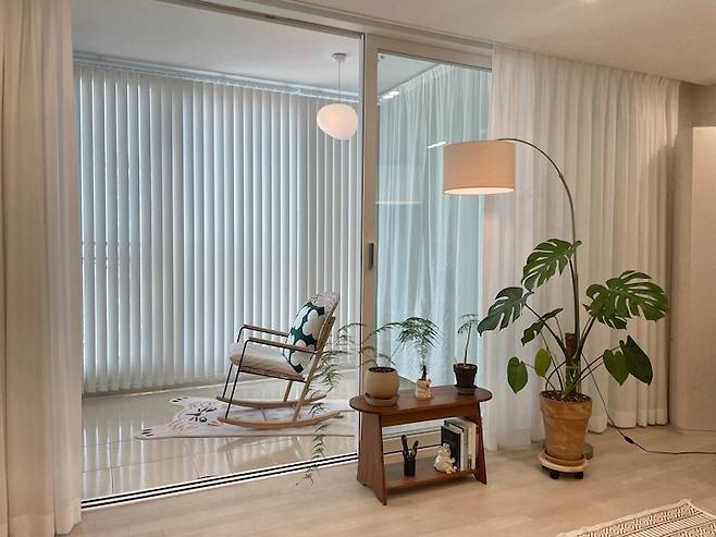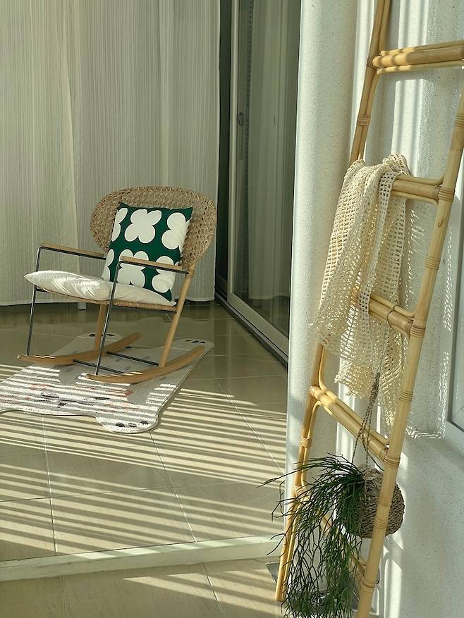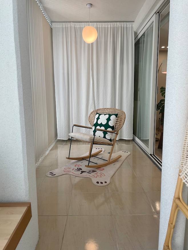 베란다는 제가 좋아하는 식물들이 있는 아늑한 공간으로 꾸며주고 싶었어요. 제 로망인 흔들의자도 같이 배치해 주고 바닥에 귀여운 러그로 깔아주었어요. 흔들의자와 러그는 이전 신혼집에서부터 가지고 있던 것들인데 이 공간에 잘 어울리는 것 같아서 다행이에요.