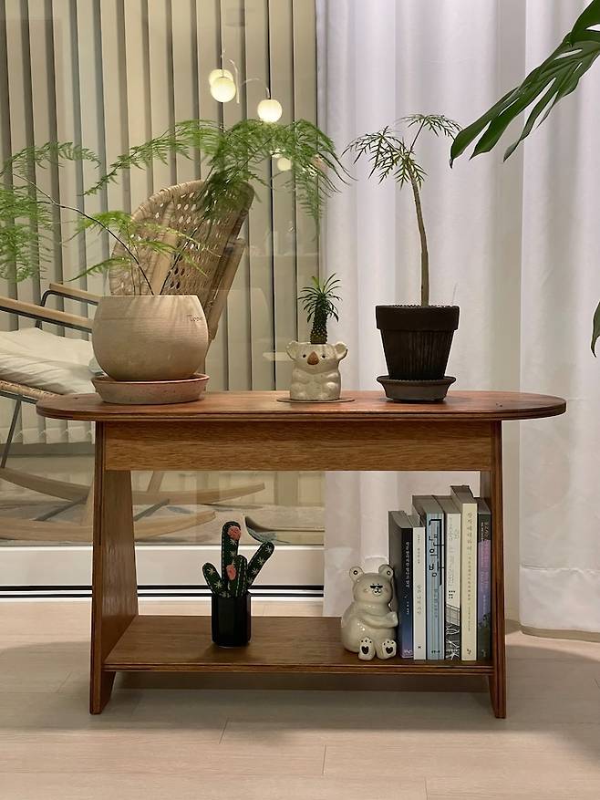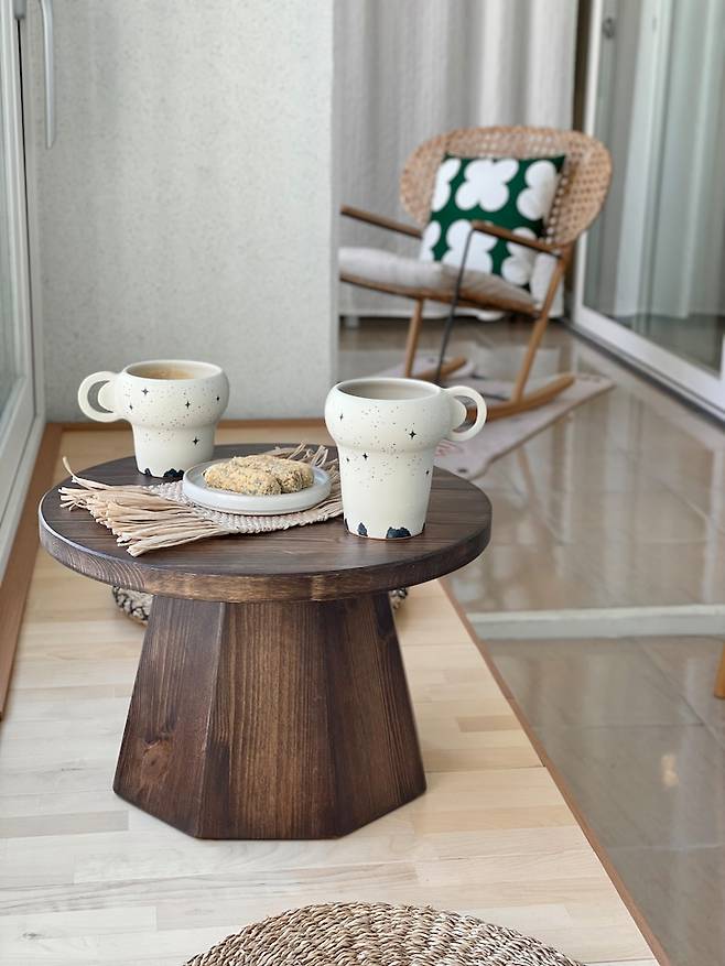 소파 앞에는 우드 제품의 소파 테이블을 두었어요. 제가 핸드크림을 자주 바르는데 크림의 유분이 테이블에 얼룩을 만들더라고요. 그래서 거실에서 자주 쓰는 물품을 올려두자!는 핑계로 캐릭터 볼을 만들어 꾸며주었어요.