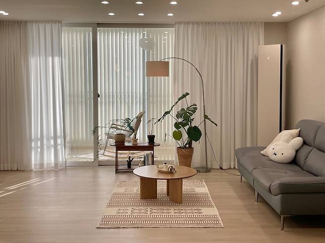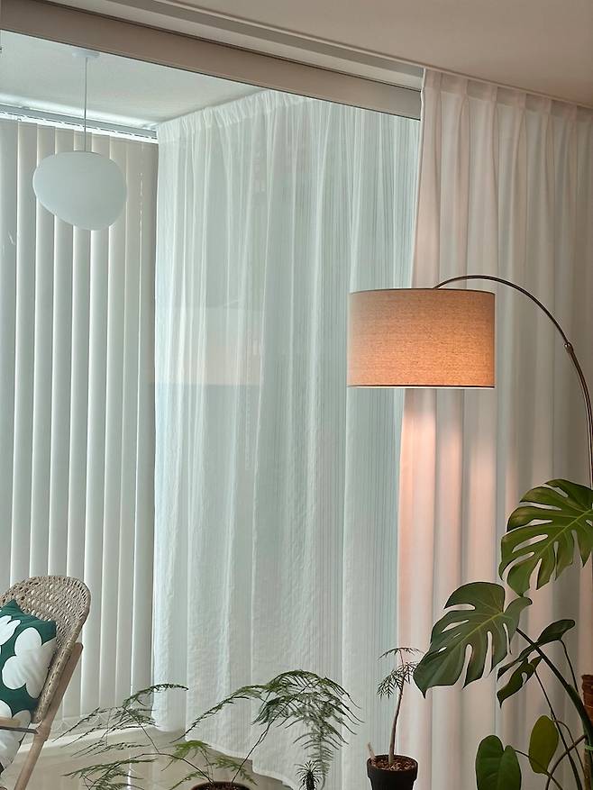 베란다에 블라인드를 해두어서 거실에는 적당한 암막만 되는 가벼운 소재의 커튼을 두었어요. 인터넷 주문 후에 남편과 셀프로 설치했는데 생각보다 쉽더라고요! 저희 집에 블라인드와 커튼들은 모두 셀프로 설치했어요.