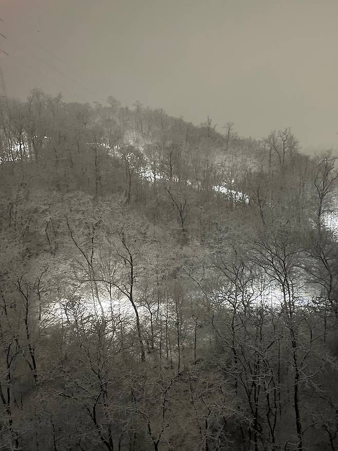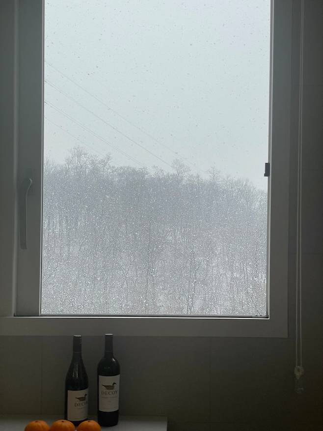 창밖에 작은 동산이라고 해야 할 것 같은 산책로가 있어요. 멋진 노을과 어울려지는 모습도 보고 눈이 정말 많이 온 적이 있는데 그땐 설경도 볼 수 있어서 좋아하는 풍경이에요.