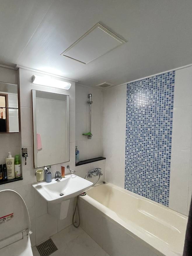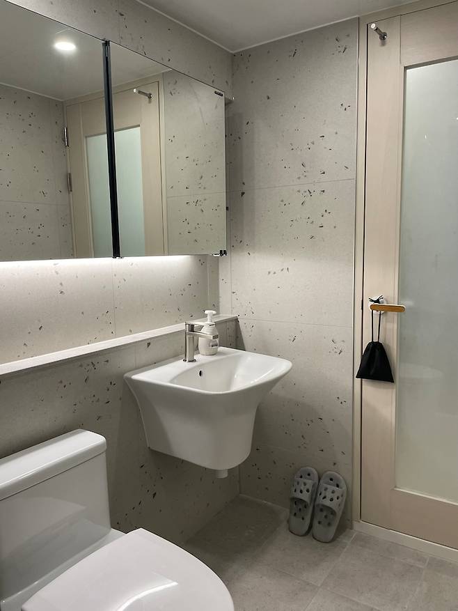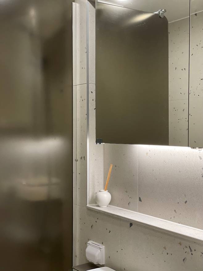 안방 화장실은 거실 화장실과 다른 무늬의 타일로 시공했는데요. 제 취향의 테라조가 크게 보이는 타일로 해서 거실 화장실보다 더 마음에 들어요. 그래서 어쩌다 보니 제가 주로 안방 화장실을 사용하게 되었어요.
