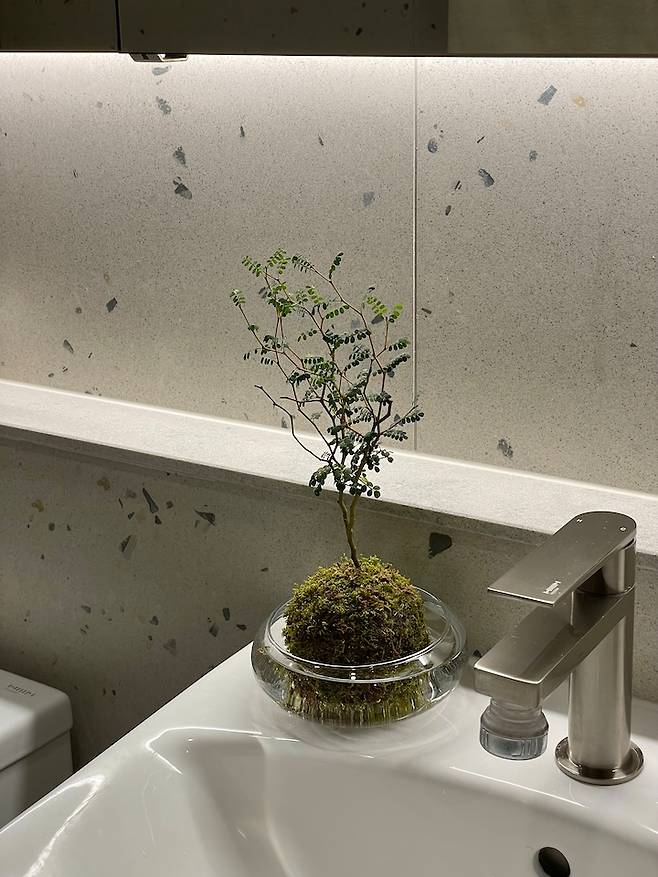 침실에서 키워주는 마오리 소포라가 코케타마로 만들어져 있어서 물을 주는 방식이 다른 화분들과 달라요. 이렇게 물을 담가두었다가 2시간 이내에 물을 빼주어야 해요. 담가두는 동안에 잠시 화장실에 두곤 하는데 조약돌 같은 모양이 있는 타일과 잘 어울려서 보기 좋더라고요.
