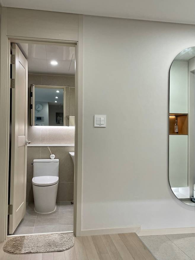 현관에서 들어오면 오른쪽에 있는 거실 화장실이에요. 다이소에서 산 달 항아리에 디퓨저 액체를 부어서 여기저기에 사용 중인데 깔끔하고 유용해서 좋아요.