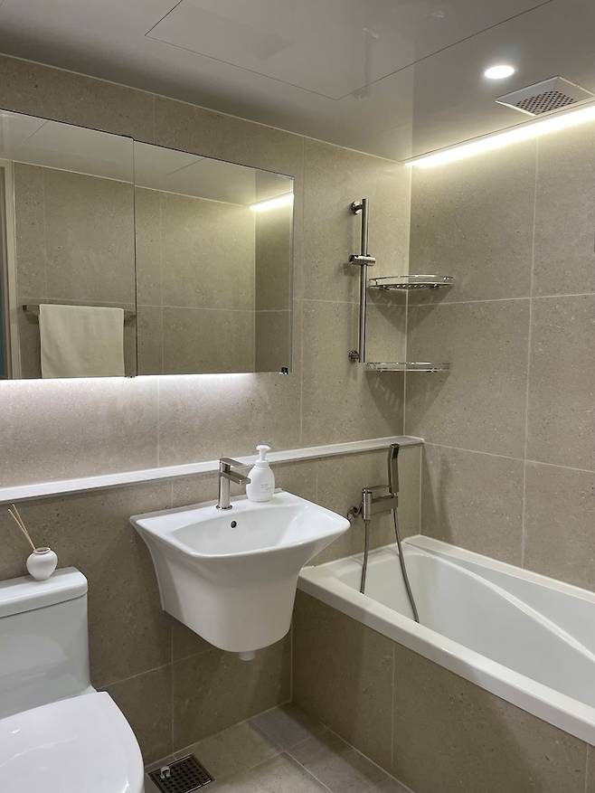 슬라이딩 거울장을 설치하고 벽에는 베이지색의 600각, 바닥에는 연회색의 300각 포세린 타일로 시공했어요. 욕조도 새로 넣어주었습니다.