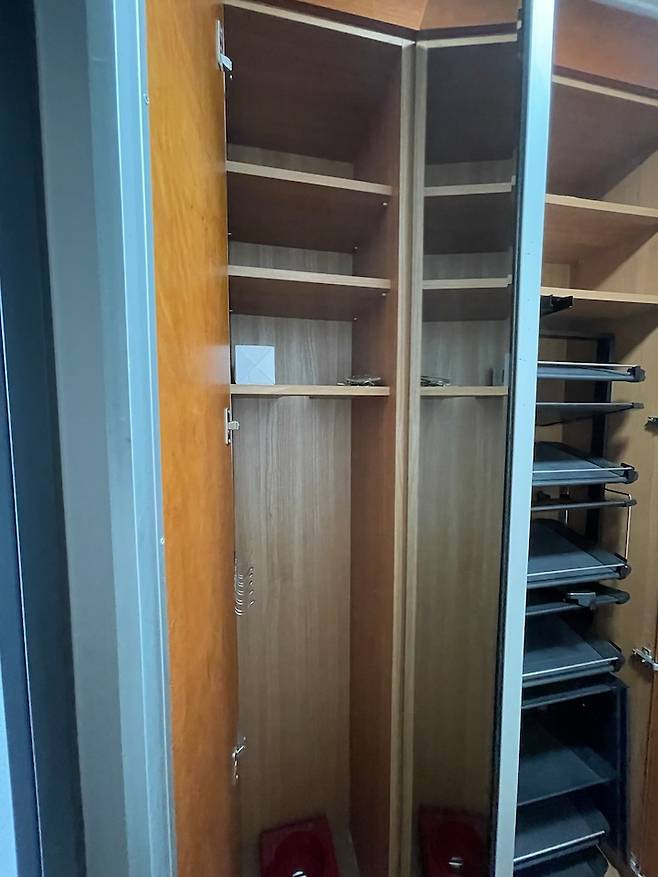 리모델링 전의 현관은 체리색 신발장에 안에 구조도 불편하게 되어있었어요.