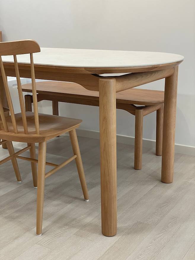 제가 좋아하는 우드와, 곡선이 같이 어우러져 있는 세라믹 식탁입니다. 식탁 상판에 오돌오돌한 재질감이 있어서 더 매력 있어요. 벤치형 의자 하나와 일반 의자 두 개를 두고 사용 중입니다.