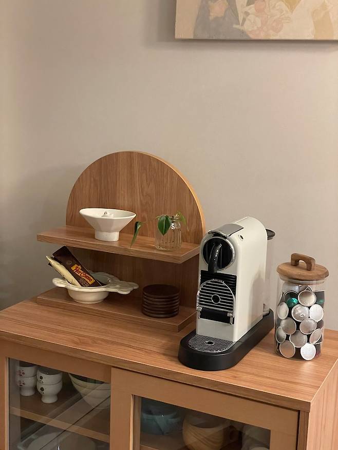 식탁 옆에는 이전 집에서도 썼던 그릇장을 두었어요. 제가 정리를 잘 못하는지 주방 하부장 안에 다 들어갈 줄 알았던 그릇들이 가득 차 있네요. 그릇장 위에는 커피 머신기를 두어서 홈까페존으로 꾸며주었습니다. 위에는 두꺼비집을 가리기 위해서 그림을 그려 가렸어요. 아직 진행중인 그림이라 살짝만 보이게 사진을 찍었습니다 :)