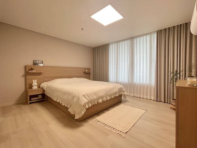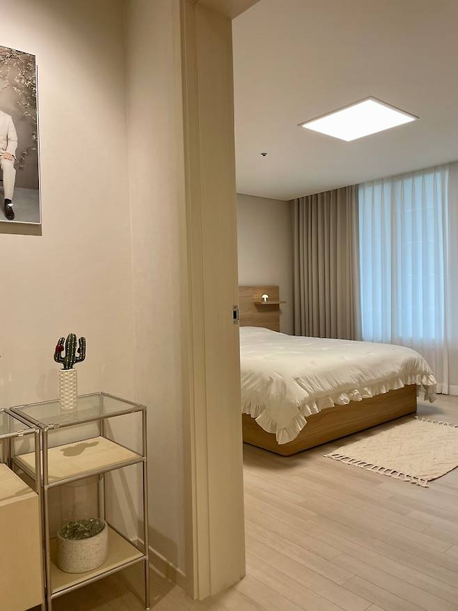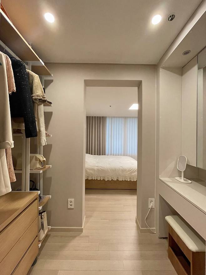 저희는 구축 아파트를 리모델링한 후에 이사를 왔는데요. 방 3개, 욕실 2개의 33평형 구조입니다. 현관 맞은편에는 드레스룸 겸 남편의 서재방, 안방에는 침실, 그리고 침실 맞은편에 제 작업실 이렇게 나누어서 3방을 사용 중이에요.