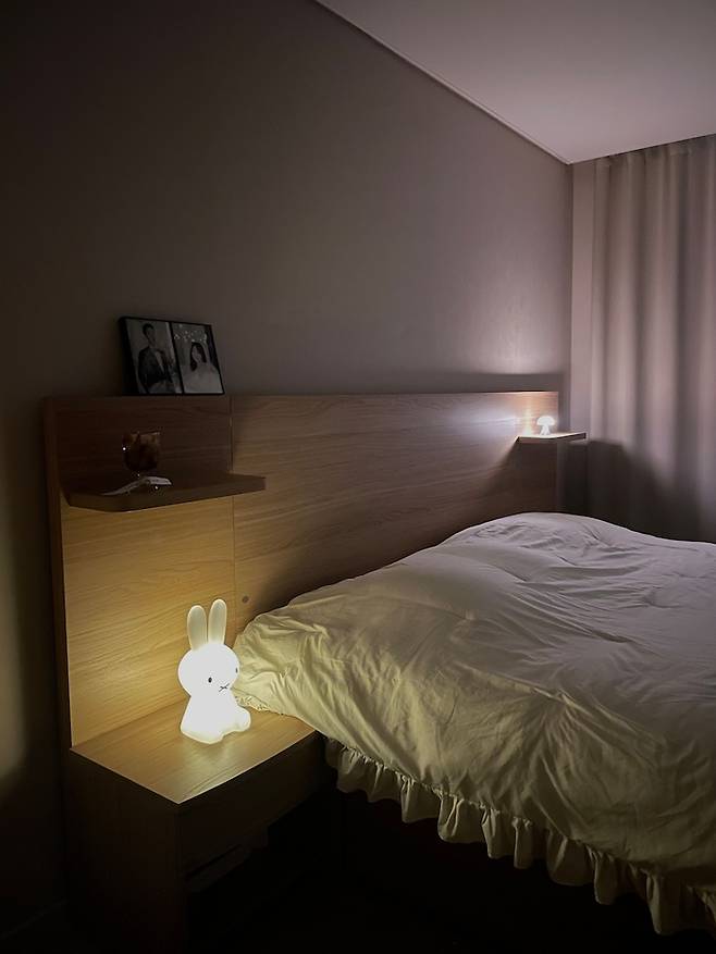 침대 협탁에 자기 전에 틀어두는 조명을 양쪽에 하나씩 두었어요.