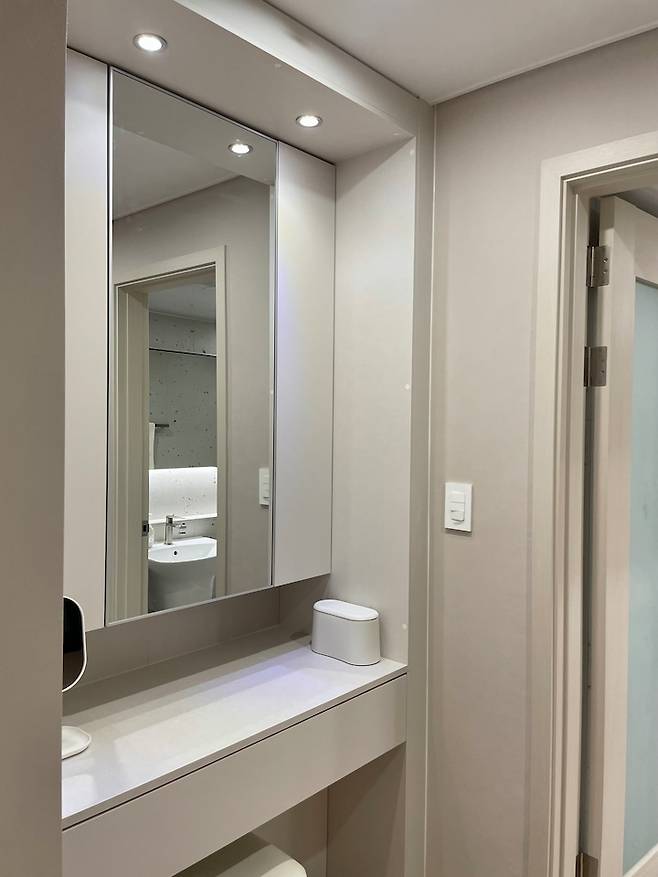 이전에는 세면대 부분이 튀어나와있는 구조였어요. 전체 철거를 하고 리모델링을 진행했어요.
