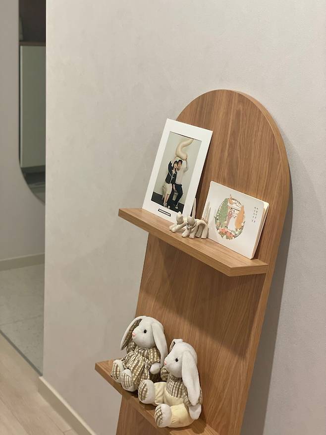 현관을 들어와 바로 옆에 있는 벽에 매거진랙을 두었어요. 저희 기념일에 찍었던 사진과 청첩장 그리고 반지 걸이를 두었어요. 결혼반지를 집에 들어와 손 씻고 빼두는데 놔둘 곳이 마땅하지 않더라고요.