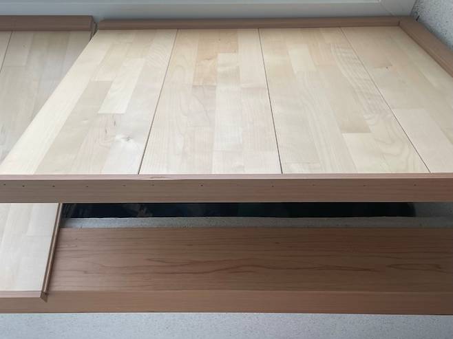 안방 베란다는 화단벽을 덮을 수 있는 평상을 만들어서 안에는 자주 꺼내지 않는 물품들을 넣어두었어요. 이렇게 조립식으로 만들어주셔서 편하게 사용 중이에요.