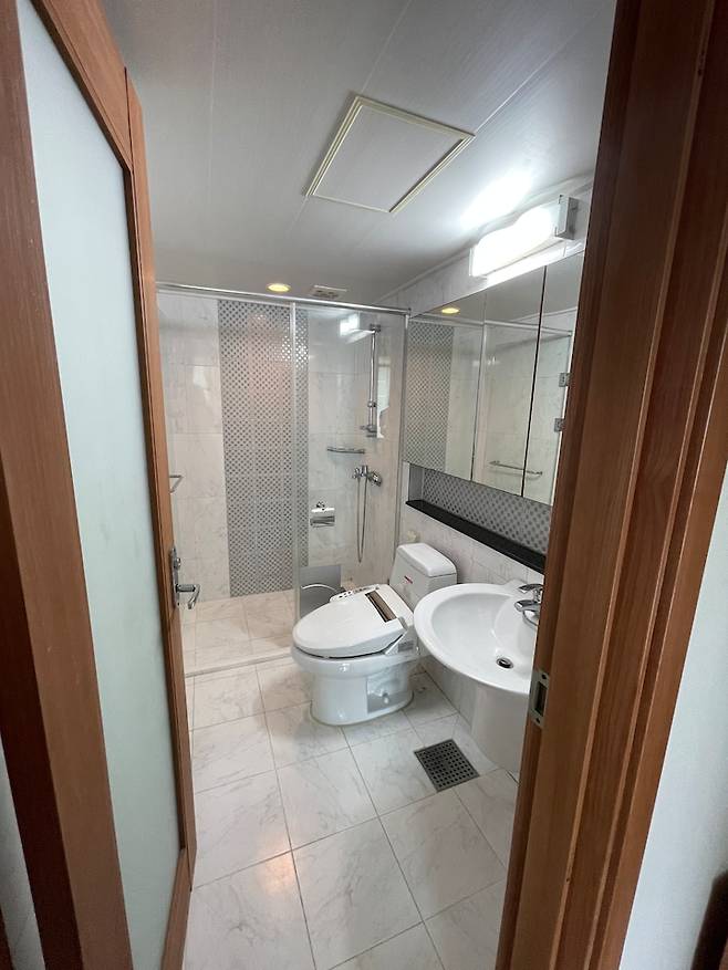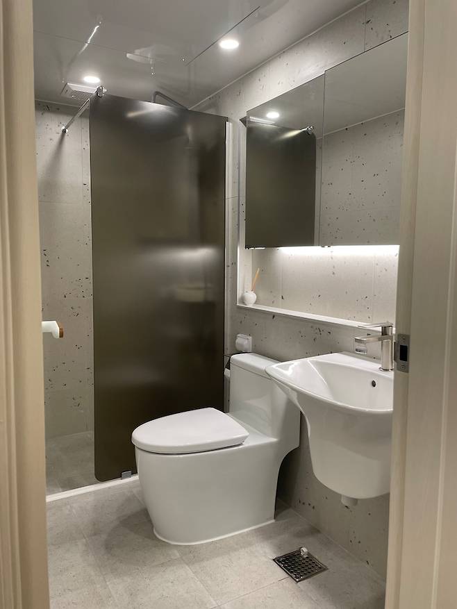 안방 화장실은 욕조가 있는 거실 화장실과 다르게 파티션으로 샤워공간을 분리해서 시공했어요.