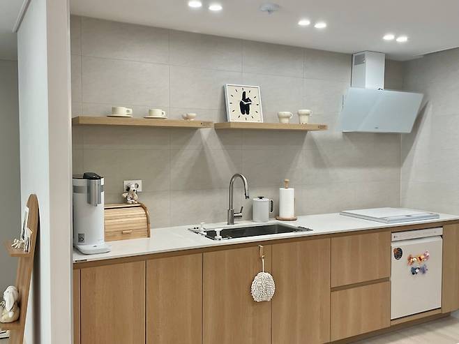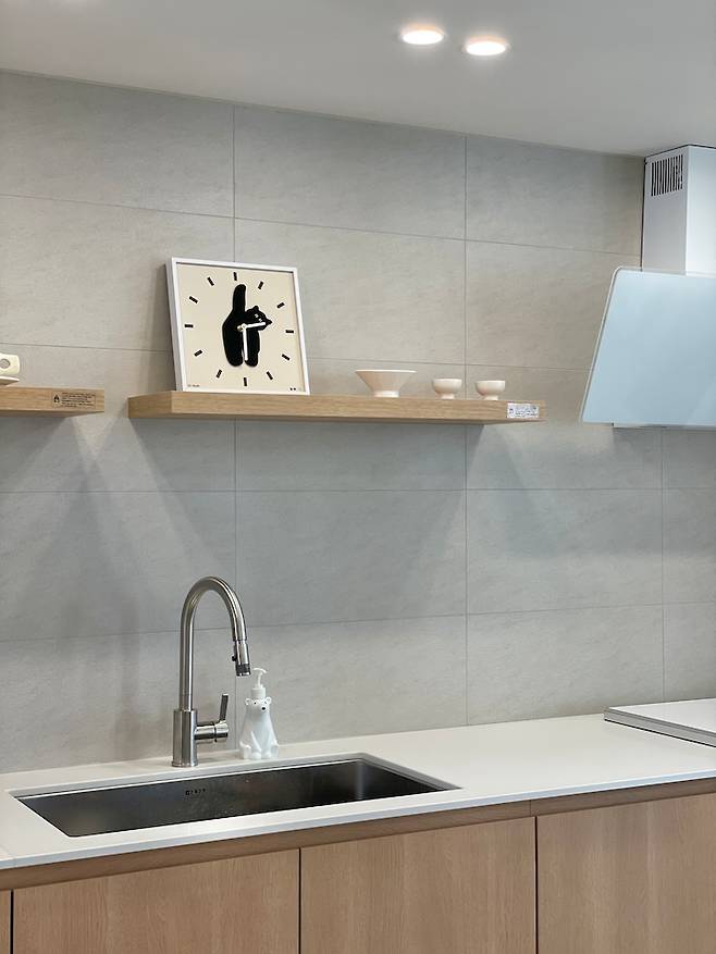 저희는 상부장을 없애 선반을 두고 베이지톤의 타일과 우드톤의 하부장으로 우드 인테리어로 진행했어요.