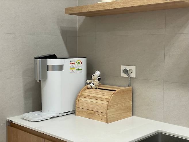 그리고 정수기 옆에 브레드박스를 두었는데요. 두 가지의 역할을 해주고 있어요. 영양제를 잘 챙겨 먹기 위해선 영양제들이 보이는 곳에 있으면 하는데 그럼 또 지저분하더라고요. 그래서 브레드박스 안에 넣어서 정리를 해주었어요. 두 번째로는 정수기 뒤에 선들을 숨겨줍니다. 주방을 깔끔하게 보이게 해줘요!