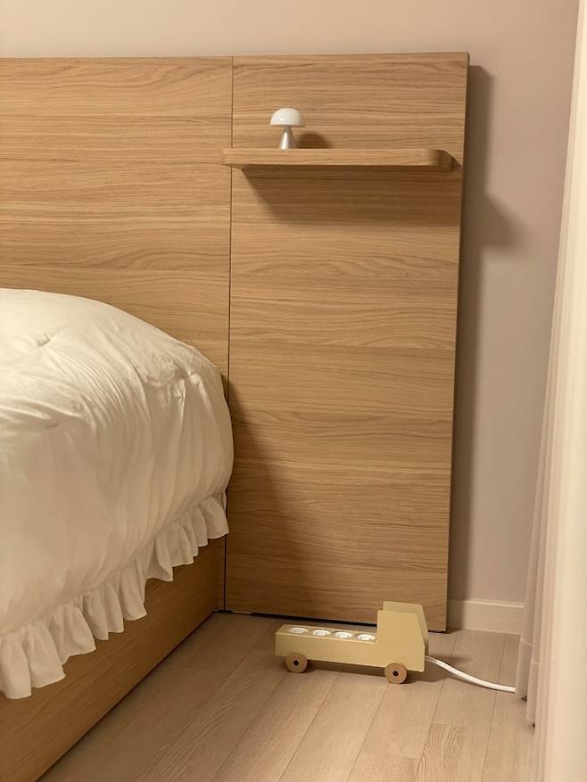 그리고 리모델링을 하면서 침실에서 콘센트 위치가 아쉬웠는데요. 당시에는 침대에서 가깝다고 생각하고 추가하지 않았는데 핸드폰 충전기 선이 닿을 정도로는 가깝지 않더라고요. 그래서 멀티탭이 필수에요. 인테리어 하실 때 꼭 체크하세요!