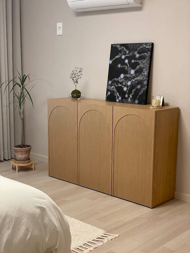 그리고 사진 아래에는 수납이 가능한 장식장을 두었어요.