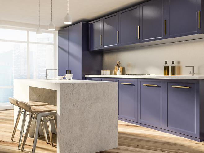 우레탄 마감재는 폴리우레탄을 스프레이로 분사하여 싱크대 문짝에 색을 입힌 마감재입니다. 싱크대 문짝 네 면과 안쪽까지 여러 번 색을 입힘으로써 깔끔한 마감과 강한 내구성이 최대 장점입니다. 따라서 습기에 가장 강한 소재라고 할 수 있죠. 단, 직사광선을 많이 받다 보면 쉽게 변색될 수 있다는 점을 기억해 주세요.