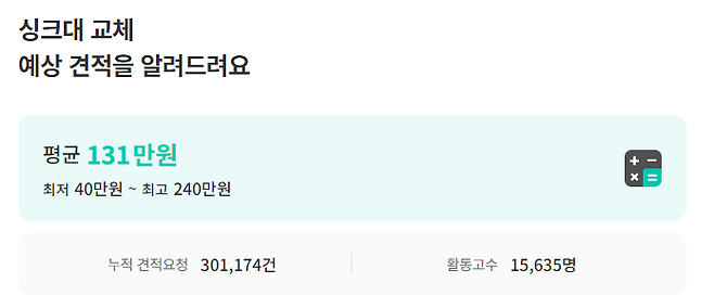 숨고 내에서 거래되는 싱크대 교체 평균 비용은 건당 131만 원입니다. 최저 비용은 40만 원, 최고 비용은 240만 원으로 책정되어 있어요.