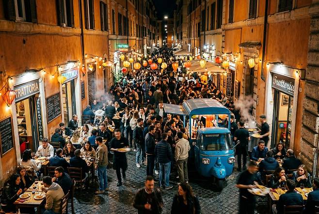 해가 저물기 시작하면 트라스테베레는 180도 다른 모습입니다. 마치 서울의 을지로 노가리 골목처럼, 조용하던 거리로 젊은이들과 예술가들이 쏟아져 나오기 때문이죠. 골목 구석구석에 숨어있던 식당들이 야외 테이블을 펼치고, 사람들의 웃음소리와 와인 잔 부딪히는 소리가 동네를 가득 채웁니다.