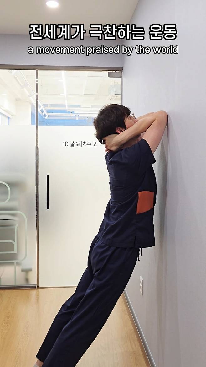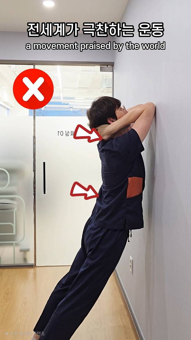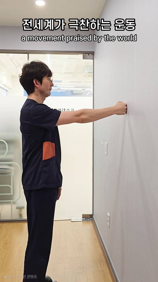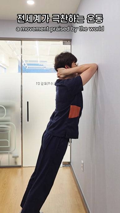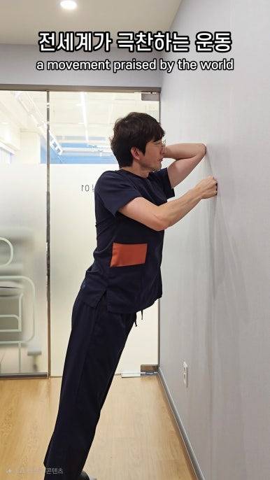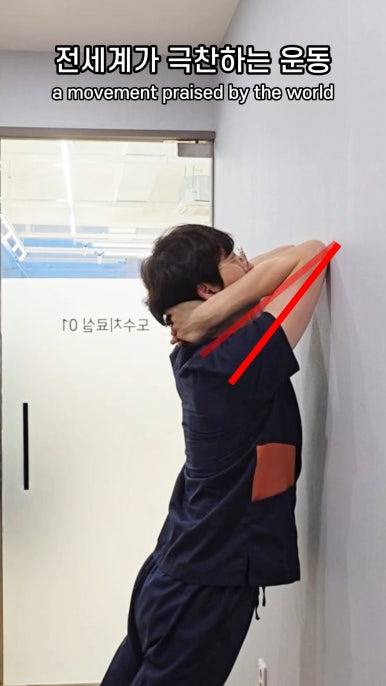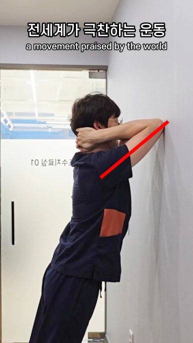 - 가슴을 벽쪽으로 내밀듯이 몸을 천천히 앞으로 기울여줍니다.