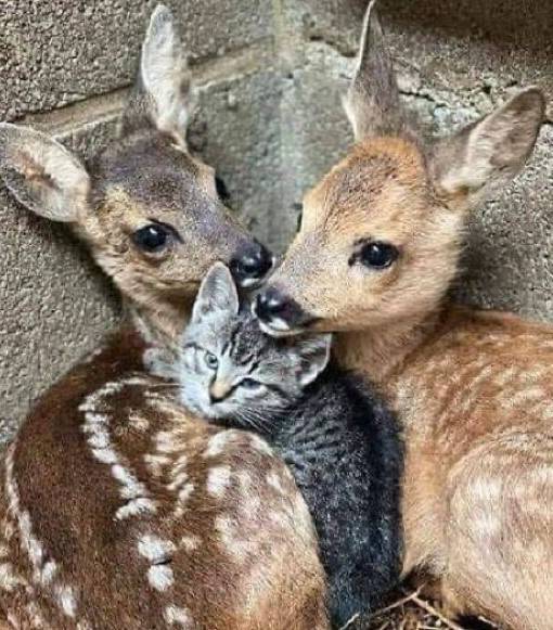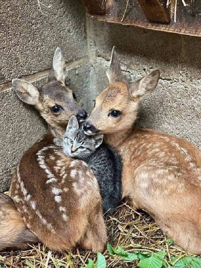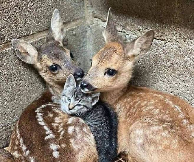 사진을 접한 누리꾼들은 "셋 다 구조된 아이들이라는 게 더 뭉클하다", "아기 사슴들이 고양이 지키는 것 같다", "이 사진 보고 안 녹을 사람이 없을 것 같다"라며 뜨거운 반응을 보이고 있습니다.