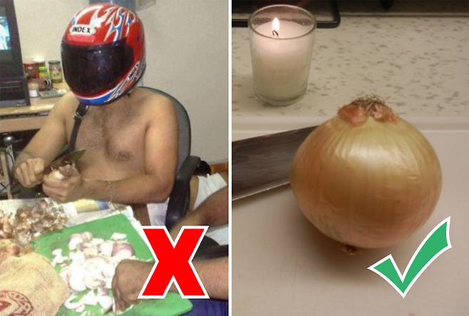 얼굴에 딱맞는 고글이 있다면 이를 사용하면 됩니다. 다소 거추장 스러울수는 있으나 많은 양의 양파를 잘라야하는 경우 이 방법을 사용하면 양파에서 나오는 황화합물이 눈에들어갈 일이 전혀 없습니다. 단, 프리사이즈의 고글은 피하는것이 좋습니다.