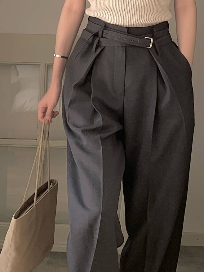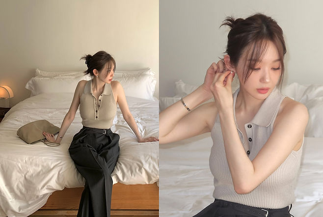 단정한 카라가 달린 베이지 민소매 니트는 몸의 실루엣을 우아하게 드러내고, 여유로운 핏의 블랙 와이드 슬랙스는 편안하면서도 시크한 분위기를 완성합니다.