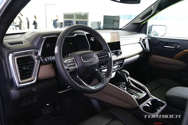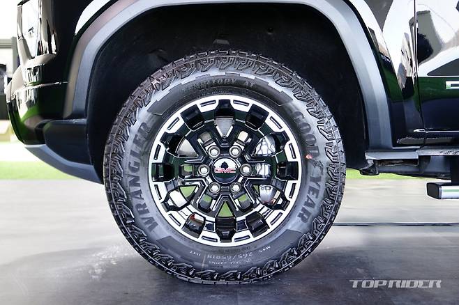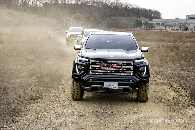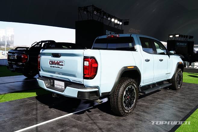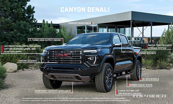 GMC 캐니언은 프리미엄 오프로드 트럭에 어울리는 강인한 외관 디자인을 갖췄다. 2인치 팩토리 리프트 서스펜션을 적용해 높고 당당한 프로포션을 구현했으며, 오프로드 감성을 선명하게 드러내며, 울트라 와이드 트랙을 적용해 넓고 안정감 있는 차체 비율과 단단한 스탠스를 완성했다.