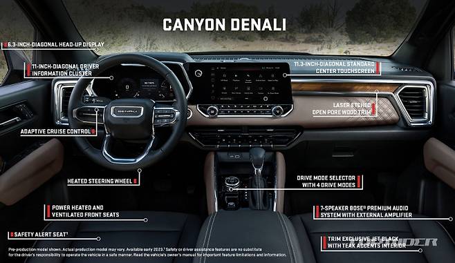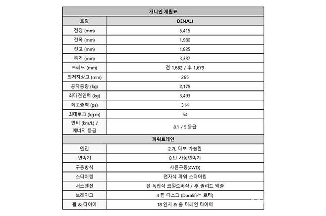 또한 국내 시장 전용 18인치 휠과 오닉스 블랙, 스털링 메탈릭, 볼케닉 레드 틴트코트, 글레이셔 메탈릭 등 총 4가지의 외장 컬러를 마련해 선택의 폭을 넓혔다. 캐니언은 ‘실버라도’의 2.7L 터보 직분사 가솔린 엔진을 탑재해 최고출력 314마력, 최대토크 54kgm의 성능을 발휘한다.