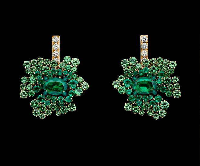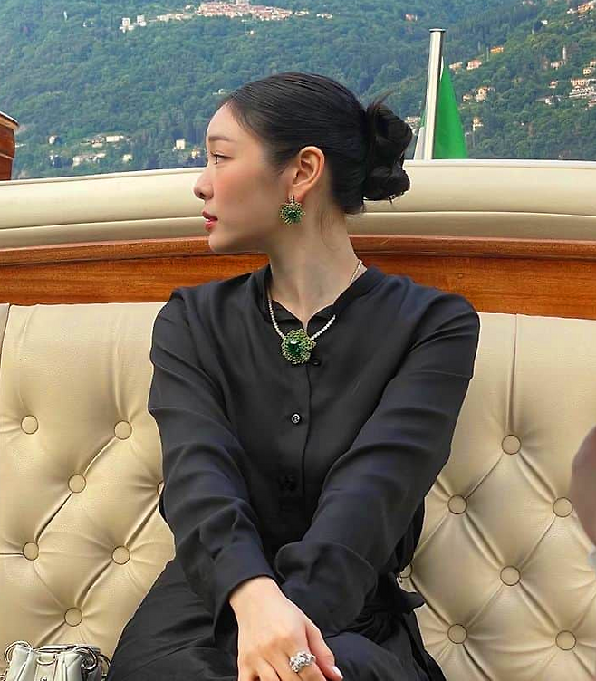 김연아의 룩에서 가장 돋보였던 것은 바로 하이라이트 아이템인 주얼리였다. 숲을 연상시키는 그린 컬러의 볼드한 귀걸이와 목걸이를 매치해 블랙 원피스에 화려한 포인트를 더했다.