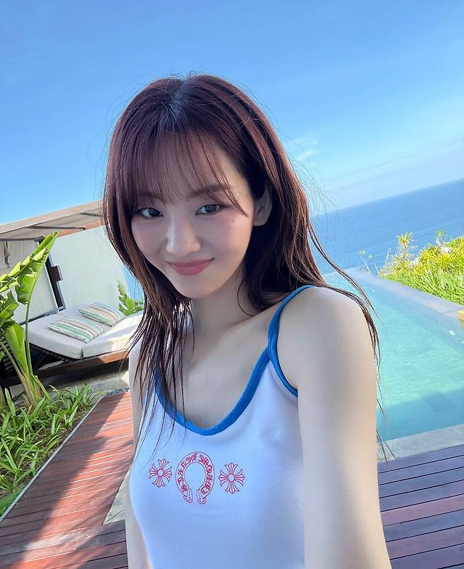 푸른 바다와 수영장이 맞닿은 풍경 속에서, 조이현은 소녀 같은 청순함을 그대로 담아냈어요.