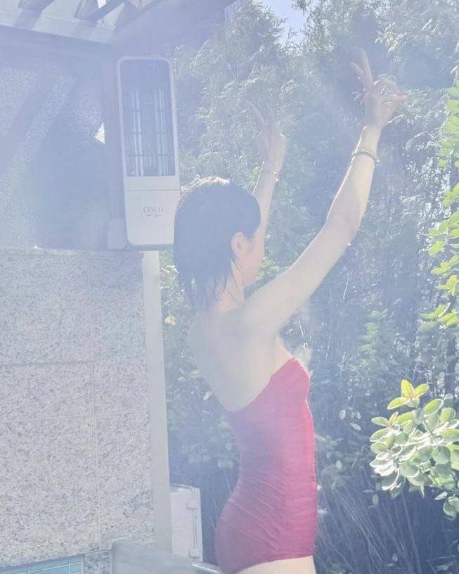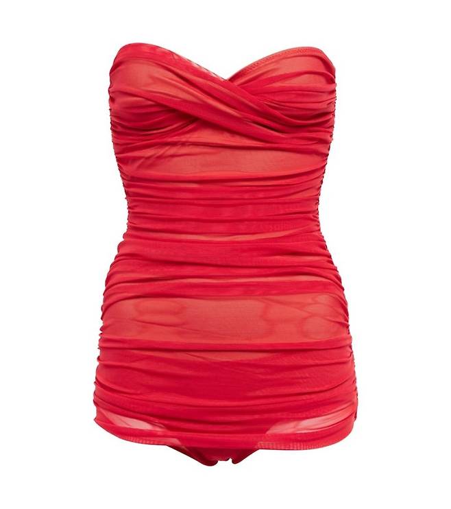 그녀가 선택한 수영복은 단순한 원피스형 수영복이 아니라, 레드 립스틱을 연상시키는 강렬한 색감과 관능적인 디테일이 돋보이는 ‘튜브탑 바디수트’ 스타일.
