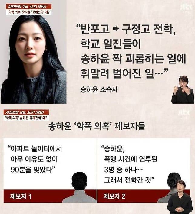 앞서 송하윤은 JTBC '사건반장'의 보도를 통해 학교폭력 의혹에 휩싸였습니다. A씨는 고등학교 2학년이던 당시 3학년이던 선배 S(송하윤)에게 불려나가 90분 간 따귀를 이유없이 맞았다고 주장했고 송하윤이 다른 학폭 사태에도 연루되어 강제전학을 갔다고 주장했습니다. 당시 소속사는 해당 내용에 대해 전면 부인했습니다.