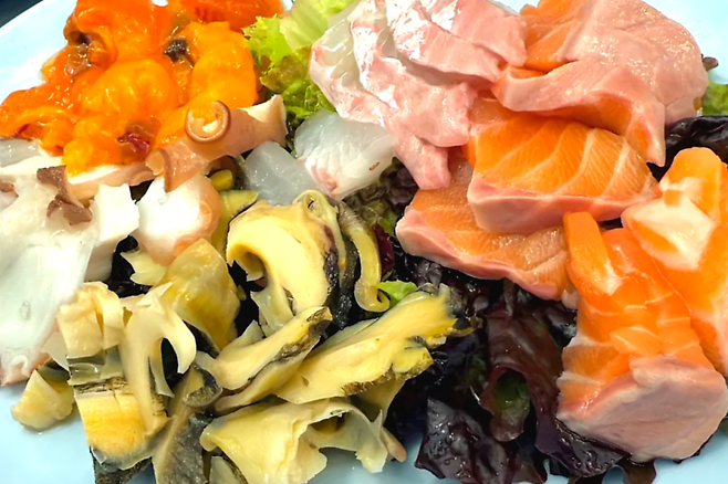 문어, 연어, 소라, 멍게 등 다양한 생선을 선택할 수 있고, 초고추장과 간장 조합이 훌륭하다. 두껍게 썰린 숙성회는 식감이 탱글하고, 시장 특유의 활기 속에서 더 맛있게 느껴진다.