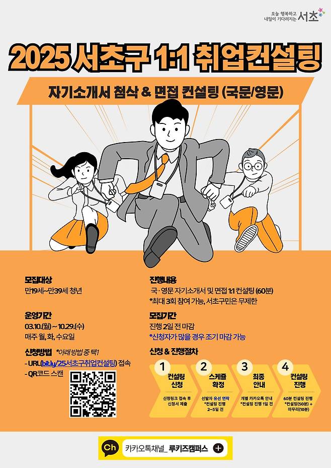 서울 서초구(구청장 전성수)는 취업을 준비하는 청년에게 국·영문 자기소개서 작성법과 면접 노하우를 알려주는 '2025 서초구 1:1 취업컨설팅'을 한다고 10일 밝혔다.