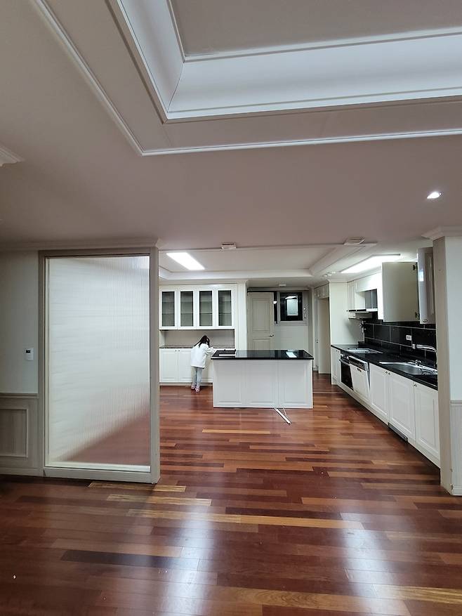 아이가 서있는 저 장식장 자리에 삼성 1도어 냉장고 3개를 넣고 싶었는데 아쉽게도 5센치가 모자라 넣지 못했습니다. 그리고 대면형 주방을 하고 싶어 수도를 중앙으로 옮길까도 고민했지만 이런 큰 구조 변경이나 설비가 들어가는 부분은 과감히 포기하였습니다.