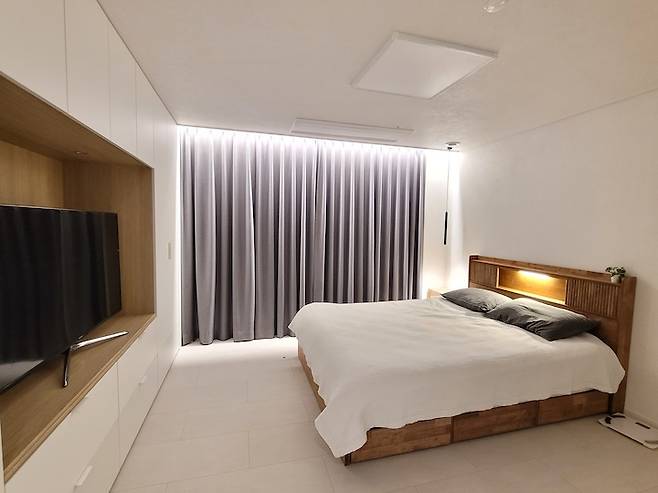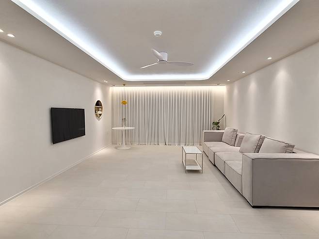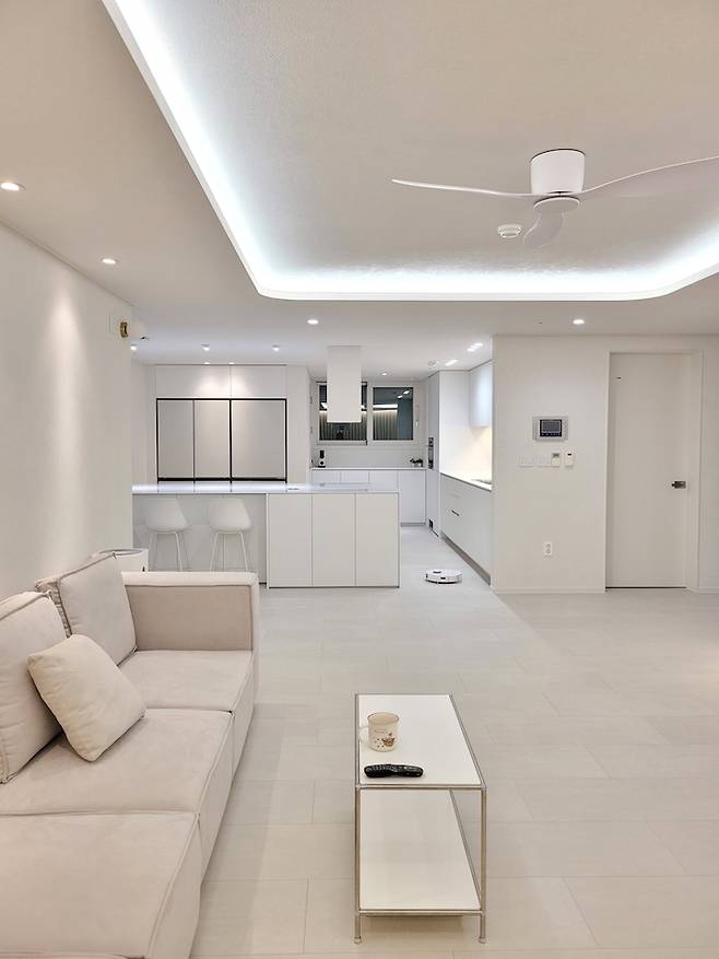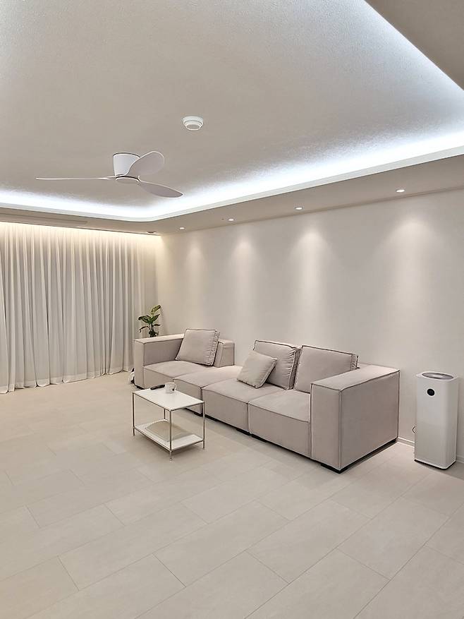 기존 천장의 우물을 살려 라운드 우물천장으로 변경 후 T5 LED로 간접등을 주백색으로 넣어 메인 조명을 하였고, 커튼 박스에는 전구색 T5 간접등, 티비, 소파 자리에는 3인치 COB 다운라이트 전구색 간접조명을 추가 하여 두가지 색감으로 가져갔습니다.우물 안에 실링팬은 알리에서 저렴히 구입해 설치하였는데 겨울엔 위에 더운 공기를 순환시켜주고 여름엔 에어컨 바람을 잘 퍼트려준다고 하네요. 아직 사용해 보지 못했지만 여름에 아주 잘 사용할 것 같습니다. 아쉬운 점은 방별로 있는 메인등을 사용하기 위해 방마다 설치 못한 게 아쉽네요 ㅎ