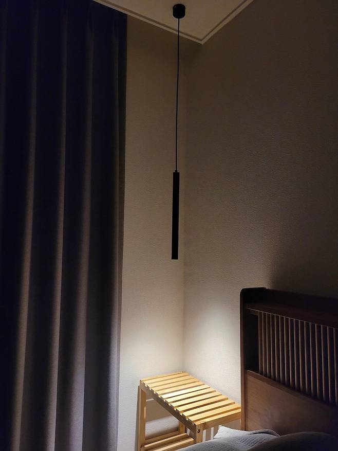 침대 옆에는 전에 사용하던 원목 선반을 두고 핀 조명을 쏴주니 이 공간도 포인트가 되어 안방의 분위기를 만들어주는 것 같습니다. 저는 정말 필요한 것만 새로 구매하고 최대한 기존 집에서 사용하던 걸 활용하고자 했습니다. 거실과 안방 커튼도 그대로 옮겨 달았답니다. 그 전 집이랑 창문 사이즈가 비슷하여 가능했지만요^^