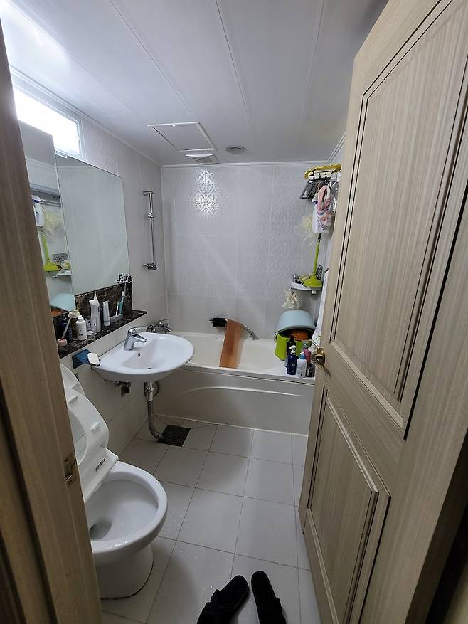 안방 욕실인데 특이하게 세면대가 문쪽에 양변기가 샤워부스 옆에 있었습니다. 이거 또한 굳이 구조를 바꾸진 않았습니다. 그전 집인 이 아파트의 32평에서 살다가 큰 평수로 이사를 오게 된건데 이 구조로 살았을때 별로 크게 불편함은 없었습니다. 이곳도 바닥 타일은 철거하고 벽은 덧방 진행하였습니다.