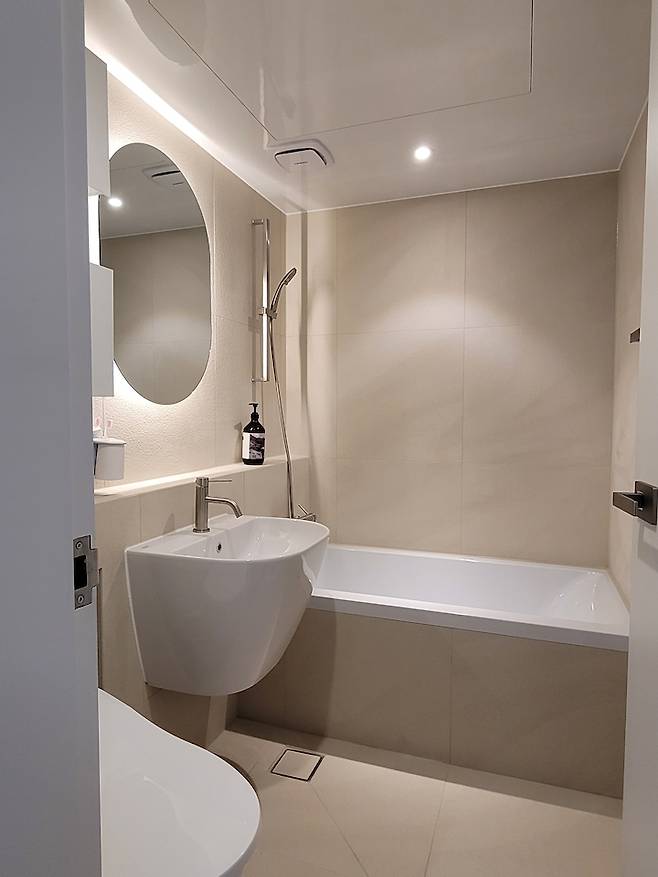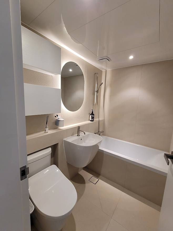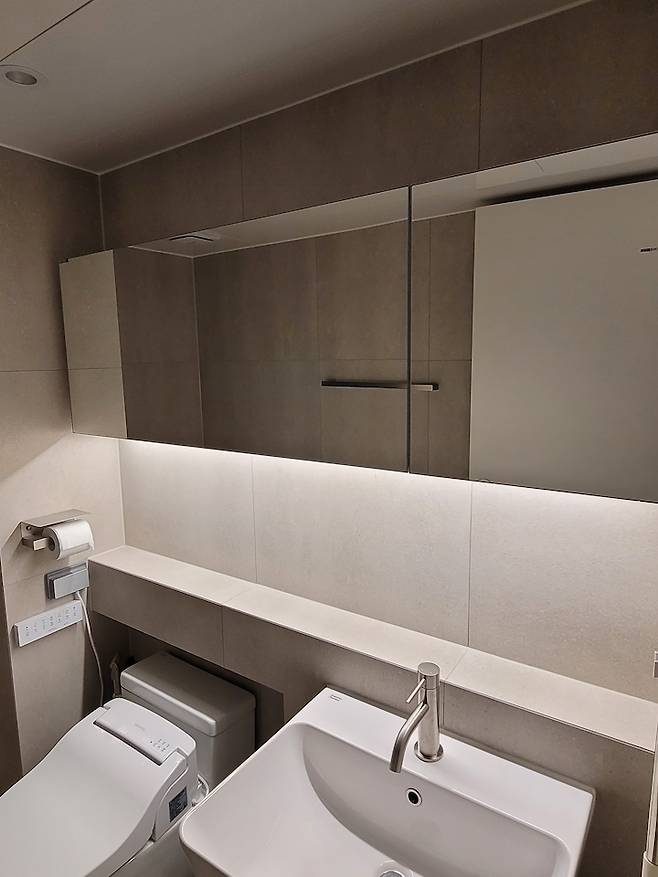 거울은 상시 LED 조명으로 선택했습니다. 욕실 거울 조명은 터치식으로 했을 때 불편하다는 글을 보고 상시로 했는데 역시 잘한 선택이었습니다. 조명은 모두 전구색으로 선택해서 따듯한 느낌이 드는데 주백색으로 하면 어떤 느낌일지도 궁금하긴 하네요. 참고로 화장실 조명은 주광색은 꼭 피하세요~