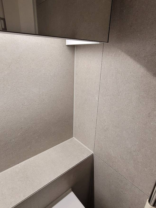 여기 욕실의 졸리컷은 정말 예술로 나왔어요. 이쪽 담당하신 타일러분 쵝오. 그리고 역시 이곳도 줄눈은 아덱스 라이트 그레이, 실리콘도 아덱스 바이오 실리콘 라이트 그레이로 깔맞춤하여 일체감 있게 마무리 하였습니다. 이곳 타일이 볼수록 매력 있어서 씻으러 갈 때마다 기분이 너무 좋아요.