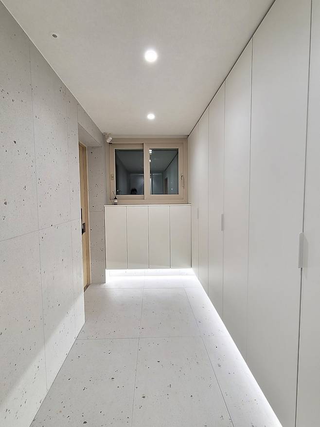 신발장은 모두 철거하고 새로 제작하였습니다. 신발장 밑은 전체 띄움을 하여 간접등을 추가해 더 밝고 분위기 있게 만들었습니다. 1200*600각 테라조 타일로 현관 바닥과 벽까지 진행하여 웅장한 느낌보다 넓고 산뜻한 느낌을 주고 싶었습니다.