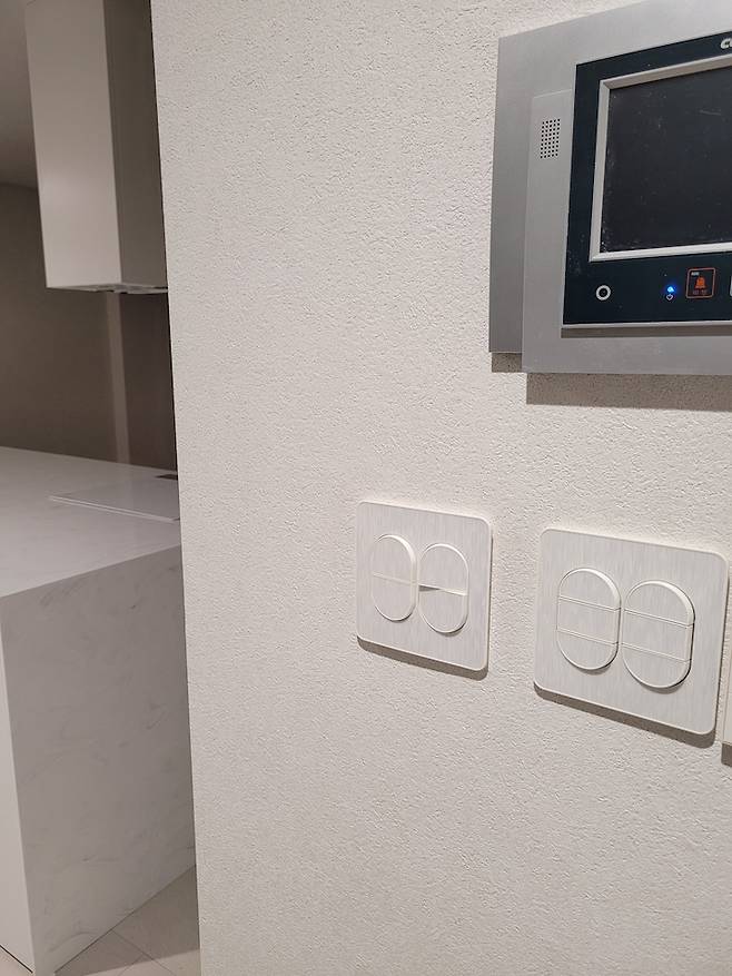 저희 집의 대부분의 스위치는 진흥 무로고 퓨어 색상 스위치입니다. 회벽 화이트와 색상이 찰떡이더라구요~ 그냥 화이트 색상은 살짝 미색이니 회벽화이트 벽지에는 노래 보일 수 있으니 꼭 퓨어색상하시길 추천드립니다. 원래 비싼 르그랑 아테오를 하고 싶었지만 스위치에 너무 큰 투자인 거 같아 이 스위치로 선택했는데 평범하지 않고 예쁘고 가격도 좋아요. 거의 아테오의 7분의1 가격입니다.