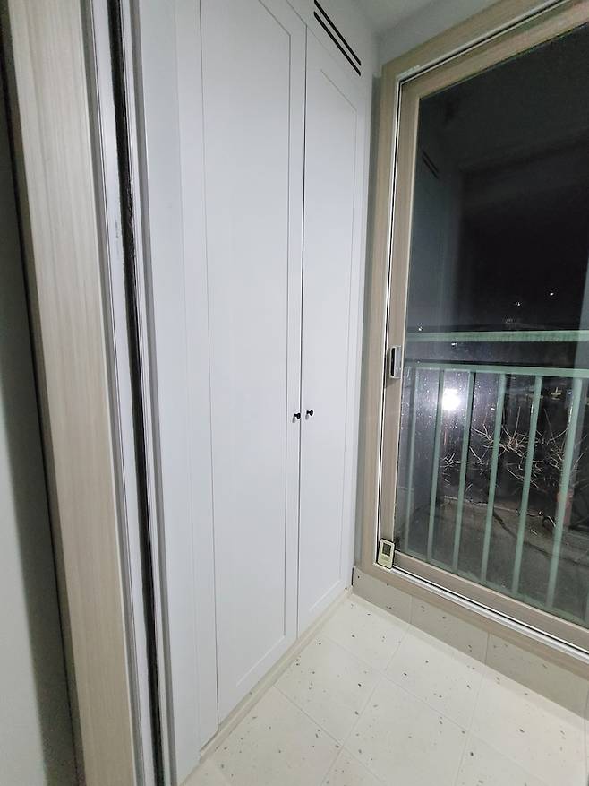 안방 베란다는 귀여운 테라조무늬의 300각 타일로 덧방을 하였고 기존 베란다 붙박이문은 살려 필름만 씌었는데 아주 깔끔해졌습니다. 살짝 아쉬운 점은 기존 샷시의 우드필름을 거실과 주방창만 화이트필름으로 작업하고 다른 창은 못했는데 나중에 살다가 추가 시공하고 싶은 곳입니다. 꼭 샷시 필름 작업시 비용투자를 해서 전체 작업하시길 추천드려요^^